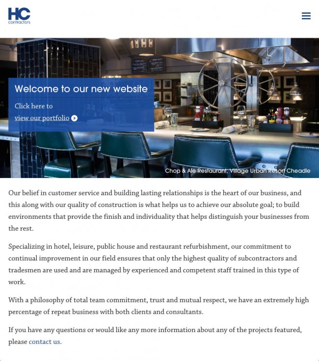 I collaborated with Nick Ebdon to design and develop a new site for HC Contractors, a UK based contracting company specializing in hotel, leisure, public house and restaurant refurbishment. The site features a portfolio section with full-screen galleries.