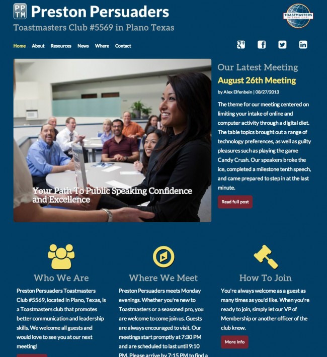 The website I built for my Toastmasters club was getting a bit old and needed a facelift to reflect the current Toastmasters brand and provide a more modern user experience. The club website has been a great tool for attracting new members so we focused on just that and kept the layout extremely simple. The personality of the club is retained in the design but has been updated to reflect the official Toastmasters International colors. I used a combination of the Lato and Aleo fonts, both of which compliment each other well and give the site a professional yet inviting feel.